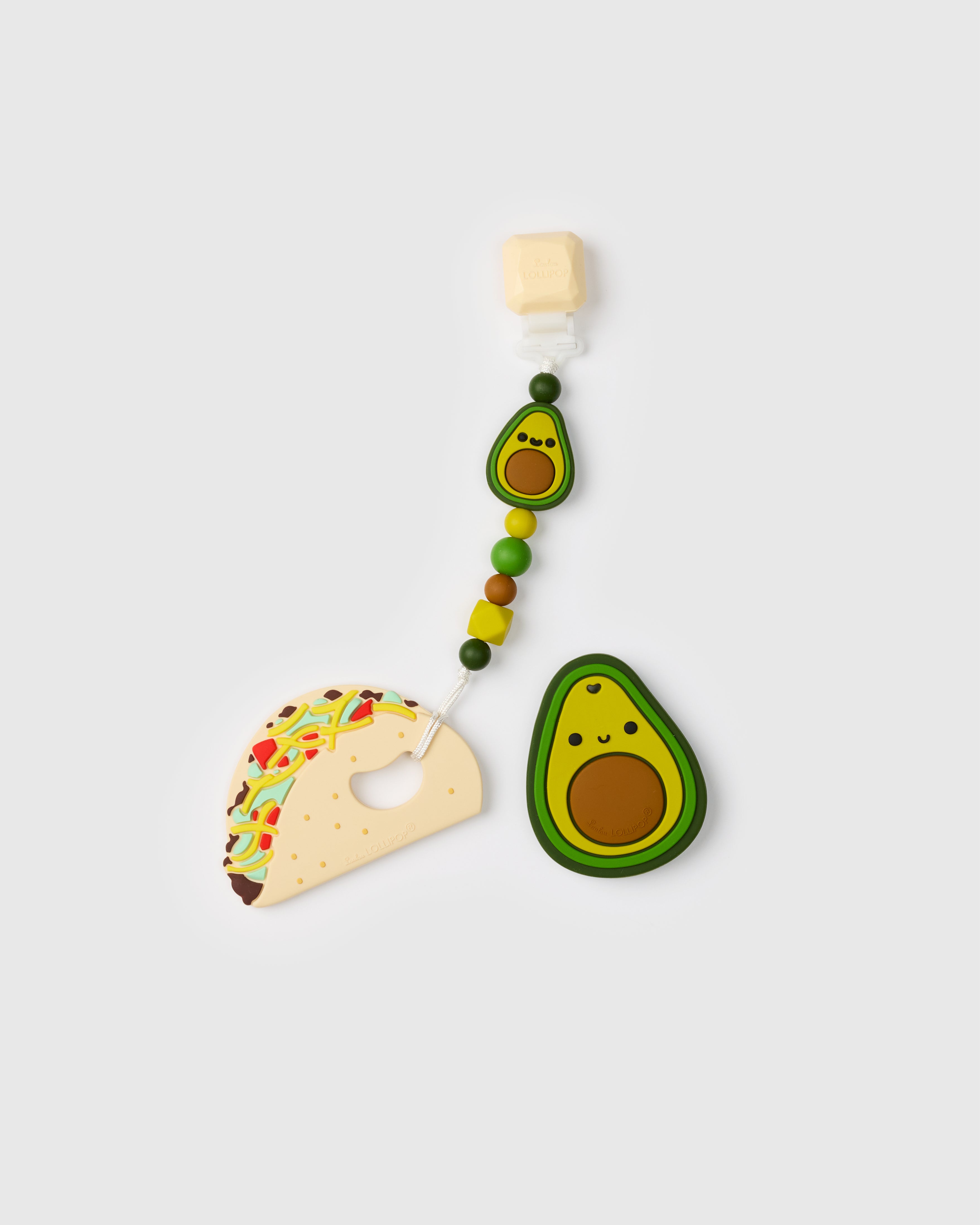 This playful bundle is perfect for little foodies, featuring an Avocado teether, a Taco teether, and a coordinating Avocado Darling clip. Each teether is crafted from 100% food-grade silicone, providing safe, textured surfaces that soothe tender gums, while the Darling clip—complete with a silicone gem clip and an adorable avocado-themed charm—keeps them secure and close at hand. For added relief, the teethers can be placed in the freezer and sanitized easily in hot water. BPA-free and dishwasher safe, this set adds a fun, foodie twist to teething essentials.
