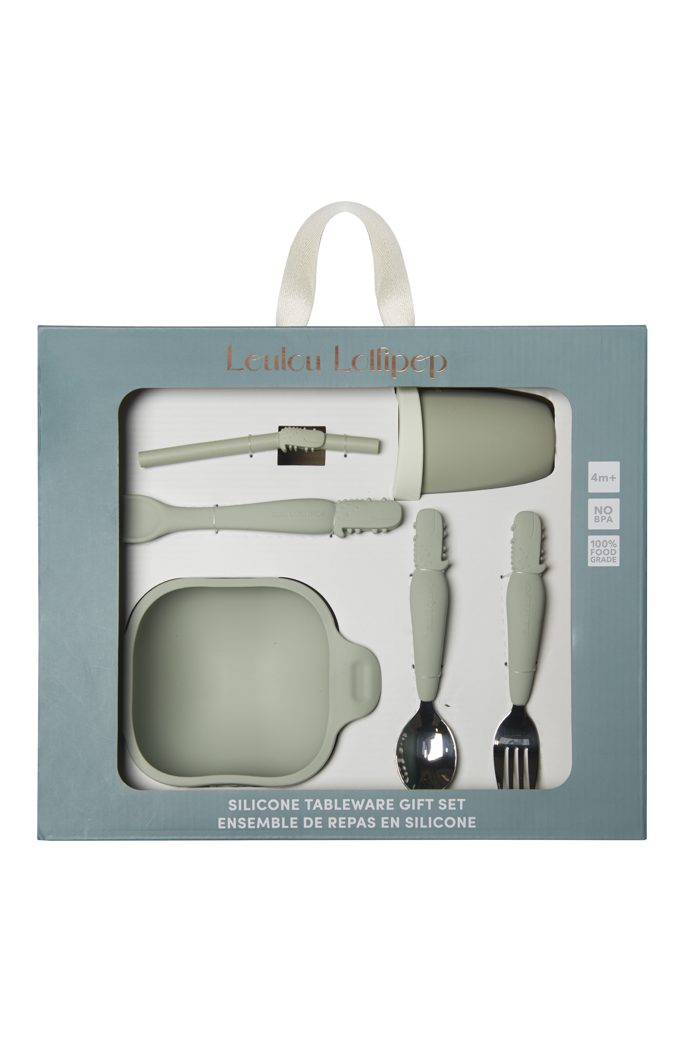 Make mealtime magical with the Aly the Alligator Tableware Gift Set! This set includes a cup with a straw, a pipe cleaner, a silicone bowl, a feeding spoon, and a kids' spoon and fork in the design of our popular sage green Aly the Alligator. Made from 100% food-grade silicone and perfectly sized for growing hands, this gift set helps toddlers master feeding while keeping meals fun. Durable, safe, and full of wonder, it turns every bite into a little adventure for your ferocious eater!