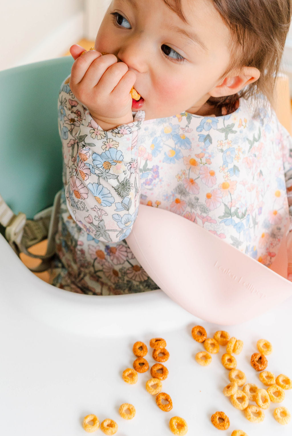 Contrairement à d'autres bavoirs, sa pochette se place sous le plateau de la chaise haute - parfait pour les liquides renversés.