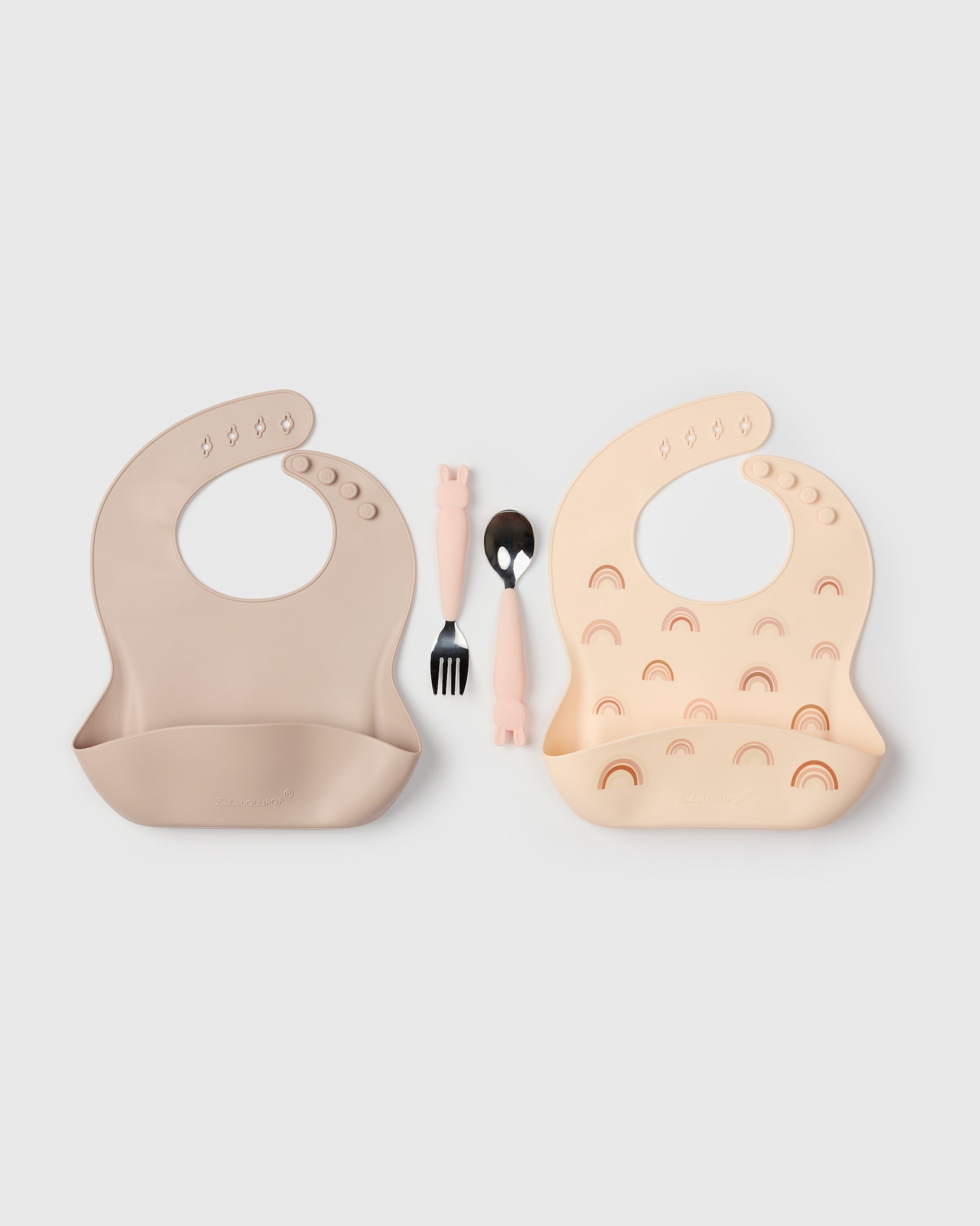 This delightful bundle is perfect for mealtime, featuring a rainbow print silicone bib, a mushroom silicone bib, and a bunny-themed Kids Utensil Set. The utensil set includes a fork and spoon with charming bunny-shaped handles, designed with stainless steel tips to make self-feeding both fun and functional. Each bib is crafted to be sturdy yet buttery smooth, keeping little ones comfortable while managing spills. Made from food-grade silicone and meeting the LFGB standard, the bibs are BPA-free, dishwasher safe, and ideal for easy cleanup—while the utensil set, due to its stainless steel parts, is not microwave safe.