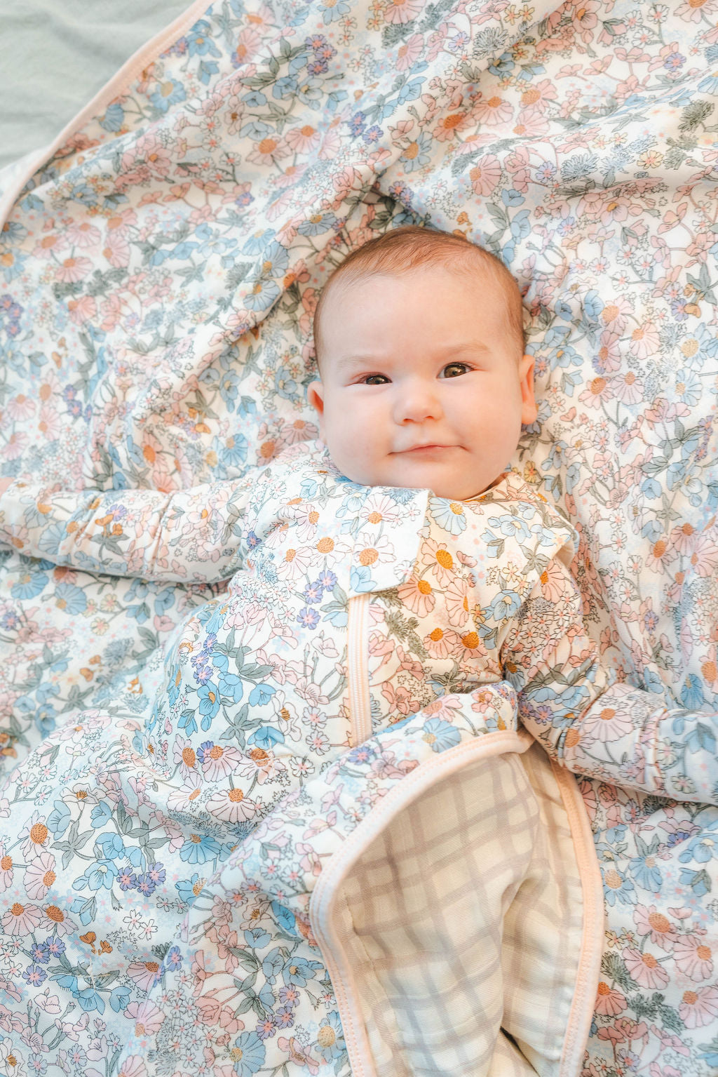 Our muslin quilts made from four layers of bamboo and cotton muslin fabric offer the perfect amount of breathable warmth and coziness to keep the baby comfortable and relaxed. This large reversible blanket is lightly quilted and features hand-drawn watercolor prints.
