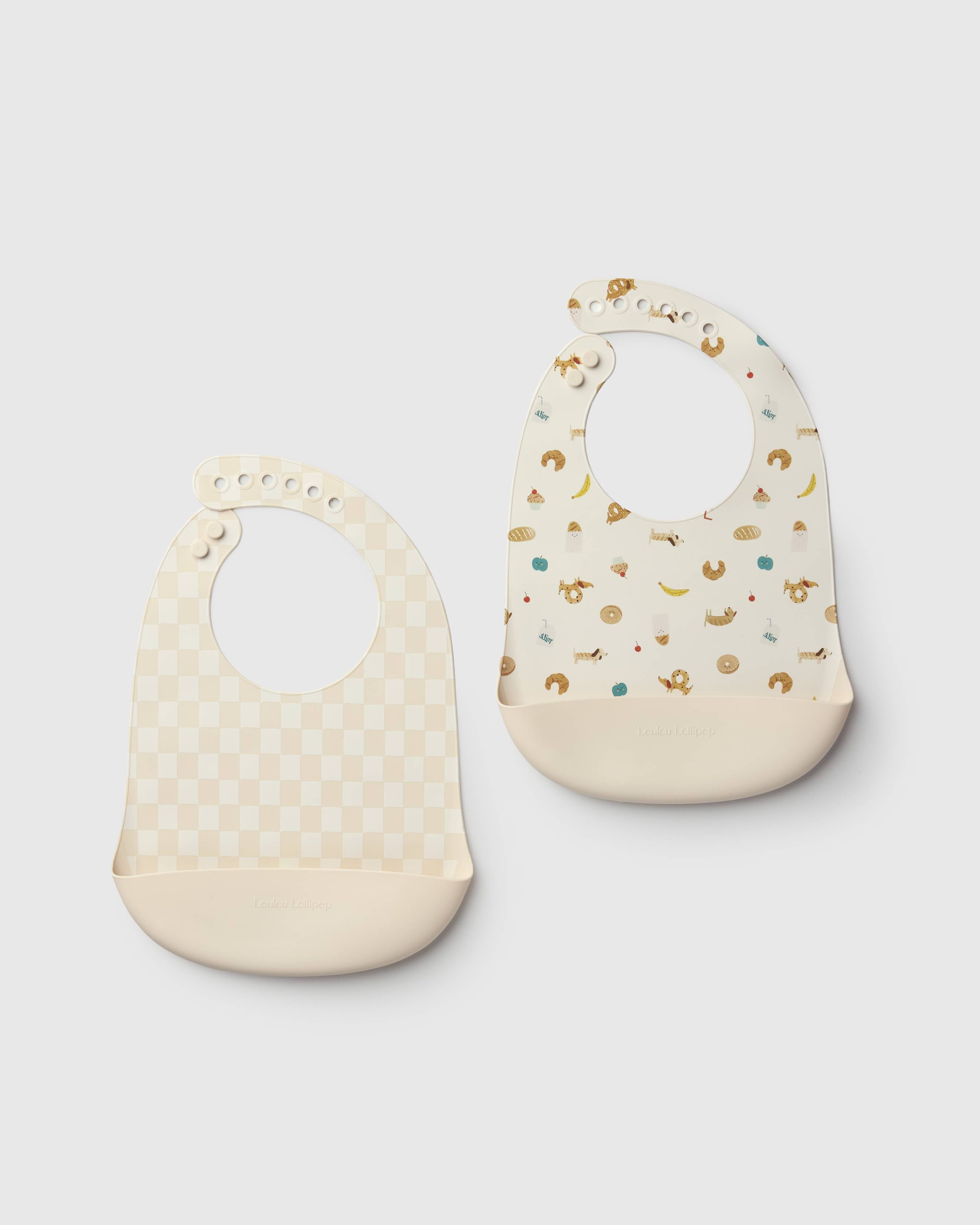 Keep your floor croissant crumb-free with this trés chic bib bundle. Our buttery-soft silicone bibs are waterproof, stain-resistant, and easy to clean (simply wipe down or put on the top rack of the dishwasher), with a wide catch-all pouch —perfect for snagging food and spills. Reinforced buttonholes offer a durable and adjustable fit for long-lasting wear, suitable for ages 3 - 36 months.